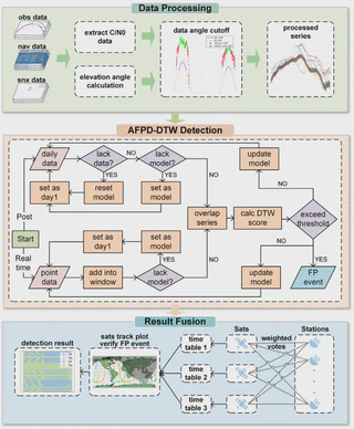 Flex power is a capability of GPS satellites that allows programmable output power redistribution. It impacts satellite product estimation strategies and positioning accuracy significantly. Therefore, it is crucial to detect its changes. We propose a flex power detection method Adaptive Flex Power Detector–Dynamic Time Warping (AFPD-DTW) based on carrier-to-noise density ratio (C/N0) diurnal patterns. Compared to previous methods relying on historical data and pre-built models, this approach requires less data while effectively detecting both step lift and overall lift patterns. We employ dynamic time warping (DTW) to address the temporal shift challenge caused by GPS orbital periodicity. The method requires data from as few as 8 stations for reliable detection, substantially fewer than the existing method, Flex Power Detector (FPD). The method is applicable for both post-processing (daily) and real-time (point-by-point) detection scenarios, achieving 0.9983 and 0.9988 accuracy, respectively. In addition, the AFPD-DTW’s post-processing speed is 20 times faster than FPD, making it particularly suitable for large-scale historical data analysis.